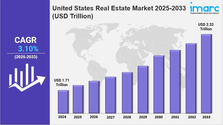 The United States real estate market size was valued at USD 1.71 Trillion in 2024. Looking forward, IMARC Group estimates the market to reach USD 2.32 Trillion by 2033, exhibiting a CAGR of 3.10% from 2025-2033.