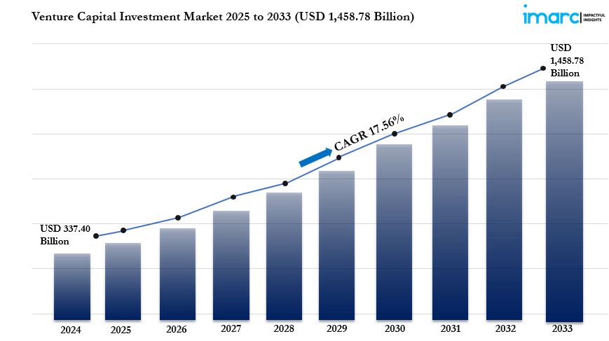 The global venture capital investment market size was valued at USD 337.40 Billion in 2024. Looking forward, IMARC Group estimates the market to reach USD 1,458.78 Billion by 2033, exhibiting a CAGR of 17.56% during 2025-2033. North America currently dominates the market in 2024, with a significant share of around 49.8%. The rapid technological advancements, a surge in startup formations, increasing digital transformation across industries, supportive government initiatives and tax incentives, growing investor interest in high-growth sectors like fintech and biotech, enhanced access to capital through crowdfunding platforms, and expanding corporate venture arms are some of the major factors augmenting venture capital investment market share.