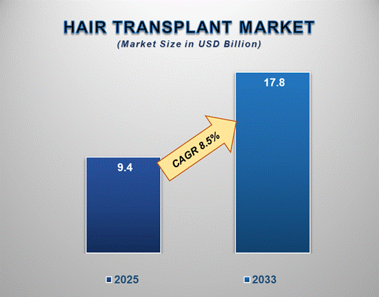 The Global Hair Transplant Market Size is witnessing robust growth, driven by rising cases of hair loss, increasing demand for cosmetic procedures, and advancements in surgical techniques such as Follicular Unit Extraction (FUE) and Direct Hair Implantation (DHI). Valued at USD 9.4 billion in 2025, the market is projected to reach USD 17.8 billion by 2033, expanding at a CAGR of 8.5% during 2025–2033.