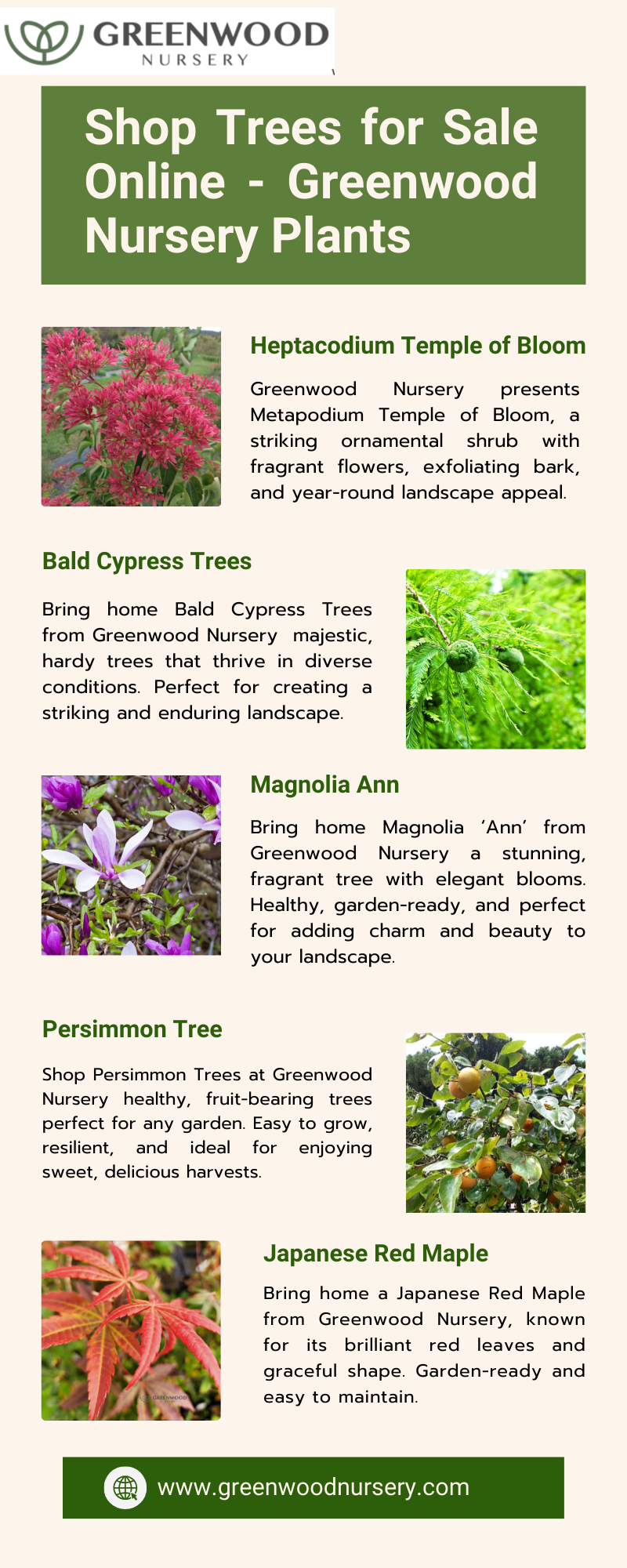 Find Beautiful Trees for Sale at Greenwood Nursery that suit your style and Budget. Each tree is hand-selected based on quality, health, and growth potential - ready to plant and thrive in your garden. For more Information, visit us: https://www.greenwoodnursery.com/collections/all-trees-for-sale